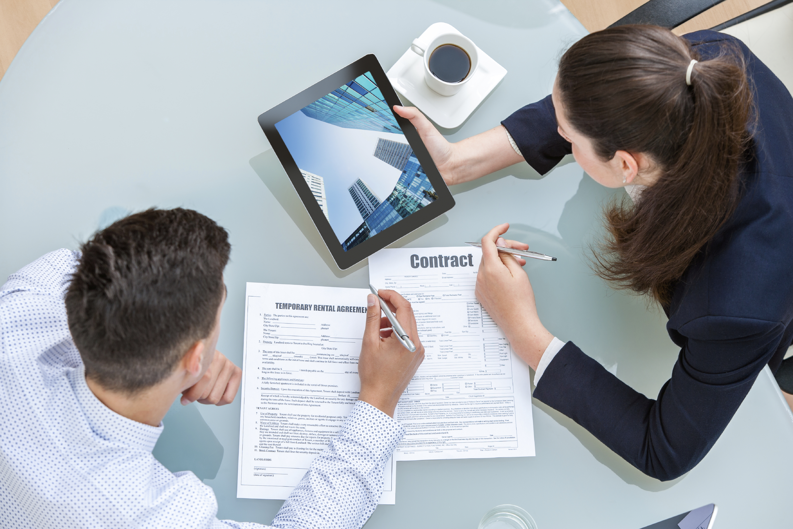 Young business couple discussing rental agreement. Woman showing man office buildings on digital tablet at table.